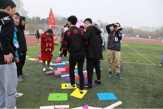 活动伊始,全体成员进行分组、商定队名、口号以及队歌,接着是精彩的游戏环节:“串名字”、 “驿站传书”、“解手环”等。活动中,一个人蒙眼,另一个人指挥,走完一段铺满指压板的道路。指压板上的小竹笋发出强大的的威力,蒙眼的同学,踩在上面痛到表情狰狞、尖叫连连,打通了全身的任督二脉,跌跌撞撞地到达终点。快乐的时光总是短暂的,活动的最后是发放奖品,根据每组得分,兑换套环,套取奖品。几家欢喜几家愁,有人套中有人空。但还有纪念奖,每个人都不会空手而归。随着欢快的笑声在操场上空传递,本次素质拓展活动顺利落下帷幕。