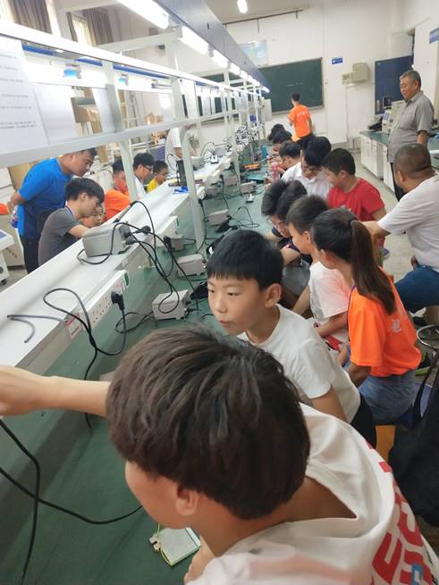 在进实验室之前,志愿者们先对小员工们讲述进实验室之后的注意事项,进了实验室后要服从指挥,不要乱碰实验室里的物品。紧接着,志愿者们就带领着小员工们进了实验室,并且一对一对他们讲解焊接知识,手把手教他们焊接。在志愿者们的不懈努力下,每个小员工们都掌握了基本的焊接知识以及焊接手法。最后,志愿者们与所有小员工们合影留念。