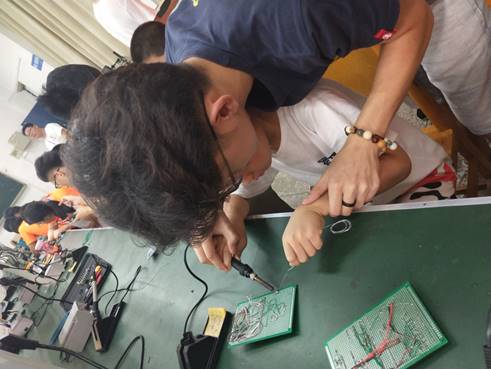 (通讯员 郑俊雄)为了加强小员工们的动手实践能力,培养小员工们对科学技术的兴趣。2018年7月6日上午九点,太阳集团tyc4633志愿者于2号教学楼A109对小员工们进行一对一焊接知识讲解和焊接辅导。