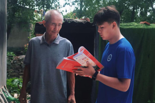 队员正在耐心为家中有员工面临升学选择的爷爷讲解招生知识