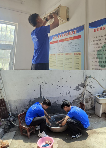 活动当天,实践团成员分成多个小组,深入农户家中与村民面对面交流。在走访过程中,同学们详细询问村民们的生活状况,认真记录村民在生产生活中遇到的困难与需求。入夏以来,老旧电风扇及空调积尘问题困扰着不少村民。“青禾筑乡”实践团的队员们发挥专业优势,立即分组入户开展电器深度清洁服务。队员们熟练拆卸扇罩、电机等部件,用毛刷、清洁剂仔细清除陈年污垢,再耐心组装调试。同时,队员们重点对村民家中的空调、冰箱等电器进行检测和维修,累计服务30余户,清洗及维修电器20余台,切实改善了村民夏季生活环境。“这些老员工技术好、态度更好,解决了我们的大难题!”村民王大爷看着重新运转的空调连连称赞。此外,队员们还协助村委会排查电路安全隐患,普及安全用电知识,赢得群众广泛好评。